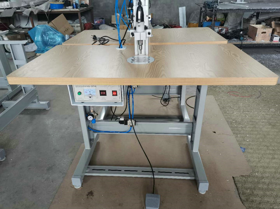 本機以超聲波將綁帶融合于口罩本體兩側(cè),進而完成綁帶式口罩成品,只需一名操作員將口罩片置于超聲波發(fā)生器的頭上,后將綁帶放在口罩片上,腳踏踏板使氣缸向下運動,縫住綁帶和口罩片。