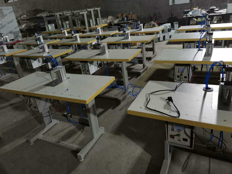 本機(jī)以超聲波將綁帶融合于口罩本體兩側(cè),進(jìn)而完成綁帶式口罩成品,只需一名操作員將口罩片置于超聲波發(fā)生器的頭上,后將綁帶放在口罩片上,腳踏踏板使氣缸向下運動,縫住綁帶和口罩片。